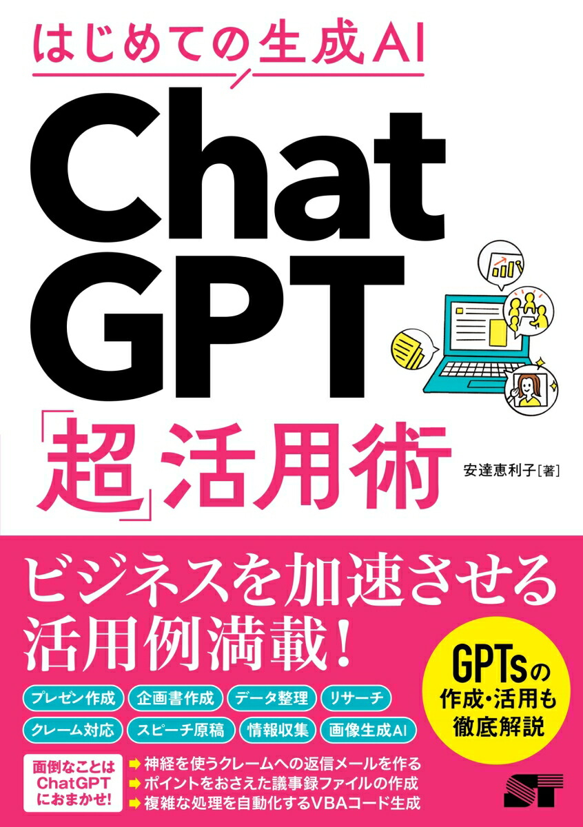 安達恵利子 | 2024年11月19日頃発売 | ChatGPTを使いこなして、さまざまな業務を効率化しよう!まだ使っていなかった人も、なんとなく知ってはいたけど使いこなせてなかった人も、本書を読めばChatGPTを使い倒して劇的に作業の効...